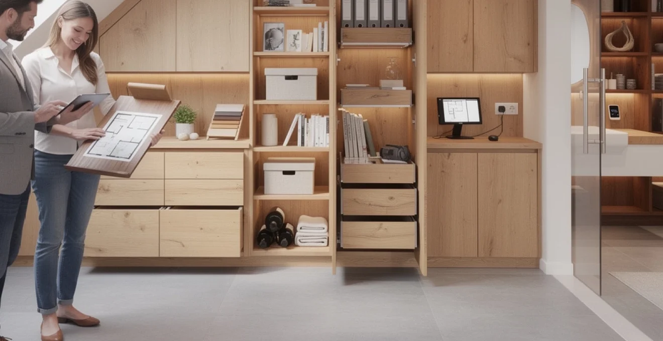 L’exploitation rationnelle des espaces sous-pente peut augmenter la surface de rangement utile de 30 à 40% dans une habitation standard.